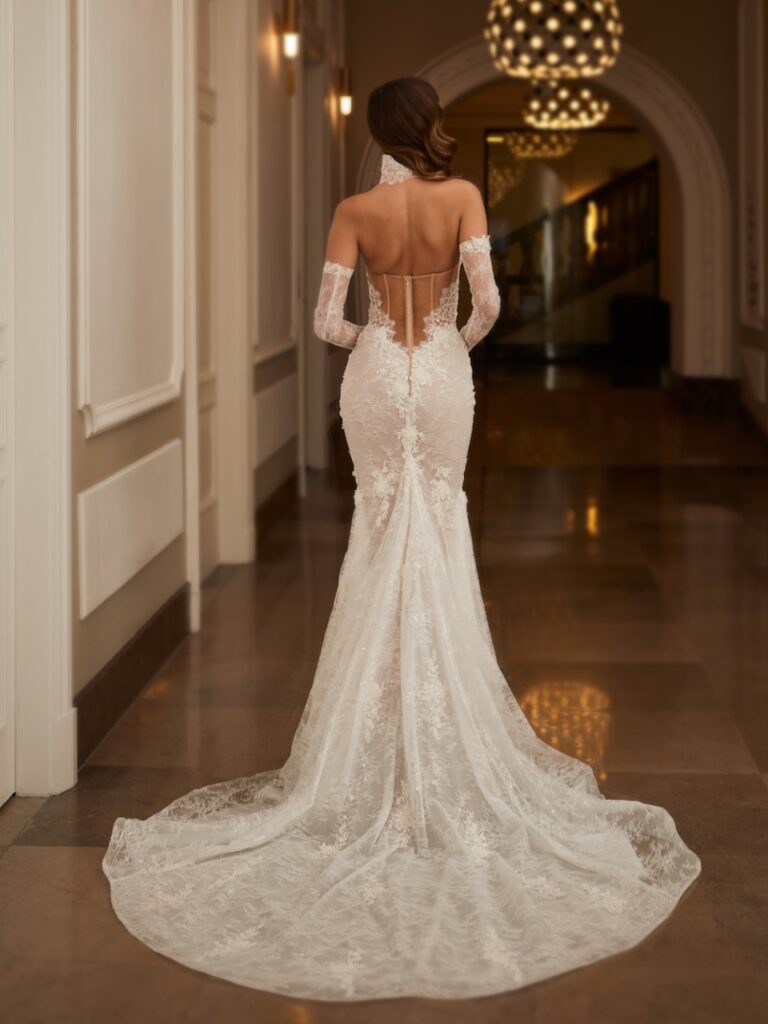Efektowna, dopasowana suknia ślubna w kształcie syreny z ręcznie naszytymi kwiatowymi aplikacjami 3D. Transparentny, zmysłowy tył gorsetu wykończony jest w kształcie litery V, wysmuklając linię pleców. Suknia posiada obszerny, efektowny tren. Dopełnieniem są dopasowane rękawki o kształcie dzwonka i/lub koronkowy choker.